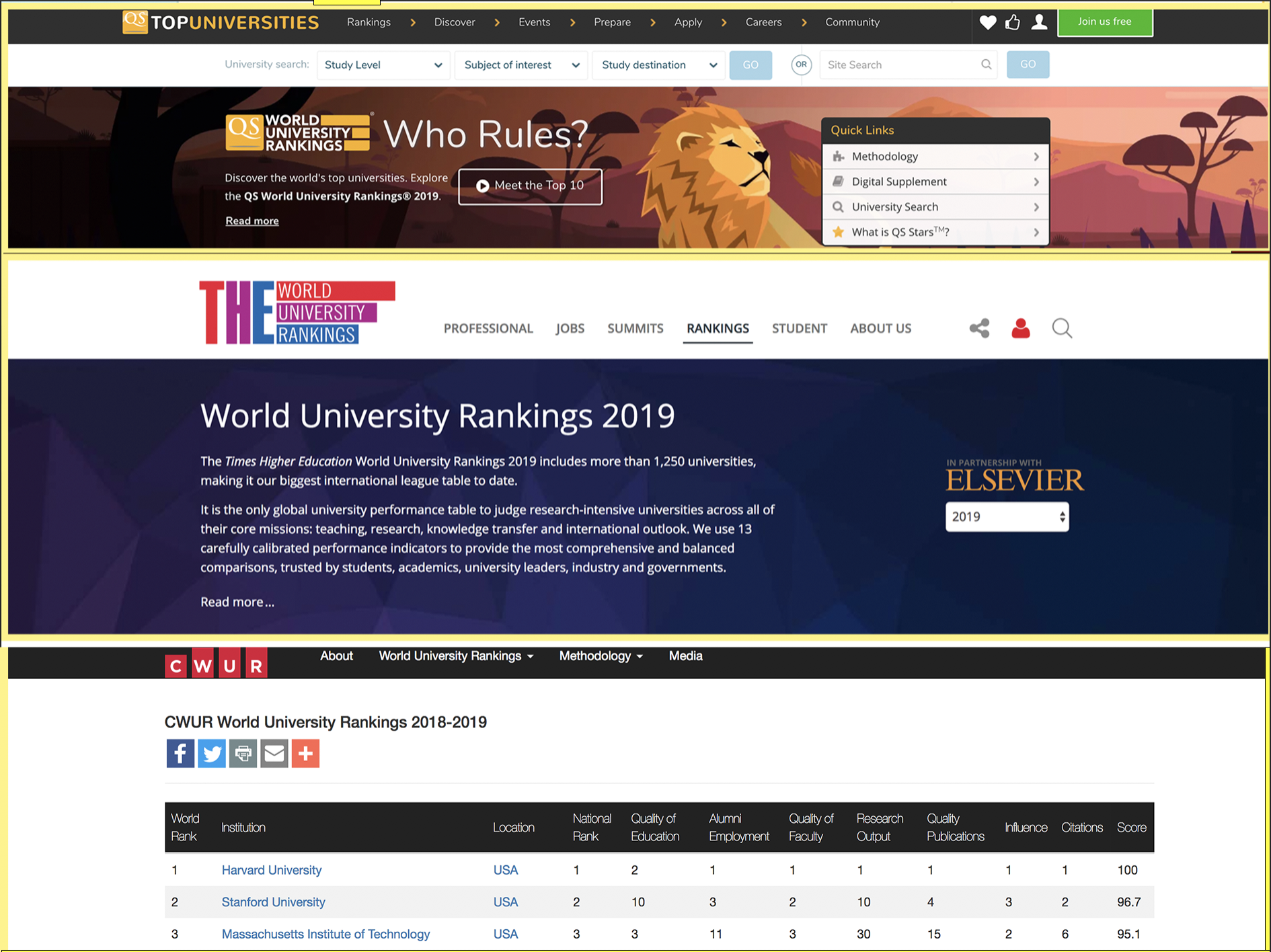 뉴스톱에서는 이 중 목표 시한이 지난 연세대, 고려대, 서강대, 동아대, UNIST, 광운대, 상명대까지 7개 대학의 순위를 영국의 QS(Quacquarelli Symonds) 대학평가, 영국의 THE(Times Higher Education) 대학평가, 사우디아라비아의 세계대학랭킹센터(CWUR, Center for World University Rankings) 대학평가, 중국 상해교통대의 세계대학학술순위(ARWU, Academic Ranking of World Universities) 등이 발표한 세계 대학 순위를 통해 확인했다. 뉴스톱에서 확인한 결과로는 목표 순위에 진입한 대학이 한 곳도 없었다.